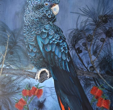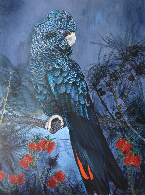 A male Red-tailed Black Cockatoo — Barrong in Noongar — sits within a sheoak as a Bunuru summer storm gathers. Surrounded by flowering orange beaufortia, he holds his place in the shifting weather.