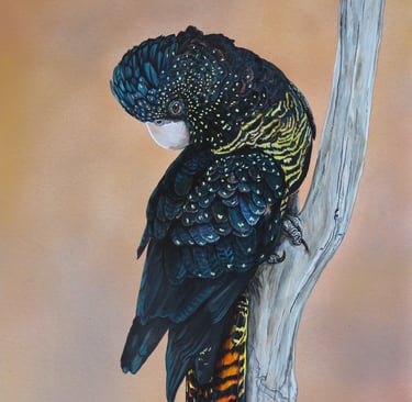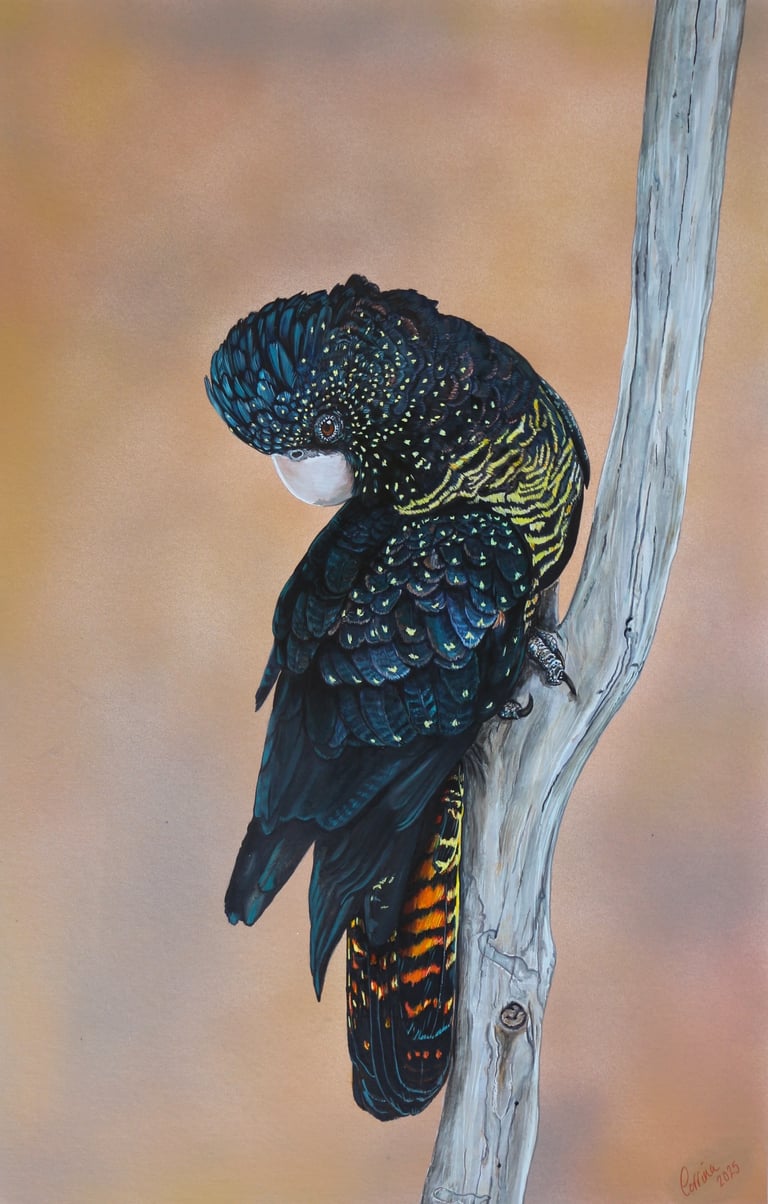 Quiet, reflective and resilient—an enduring presence holding fast to the fragile landscapes it depends upon, much like she clings to the branch. Inspired by a photograph by Mark Loh.