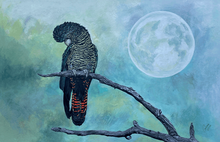 A female Red-tailed Black Cockatoo sits alone, stoic beneath the moon, a quiet symbol of strength and solitude. This iconic bird is now listed as vulnerable, a reminder of the fragility of the landscapes it calls home. Inspired by a photograph by Jason Moore.