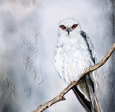 A Black-shouldered Kite. Its intense crimson eyes—caused by blood vessels visible through the iris—give the bird a piercing, watchful gaze and help enhance contrast when scanning the ground for prey.